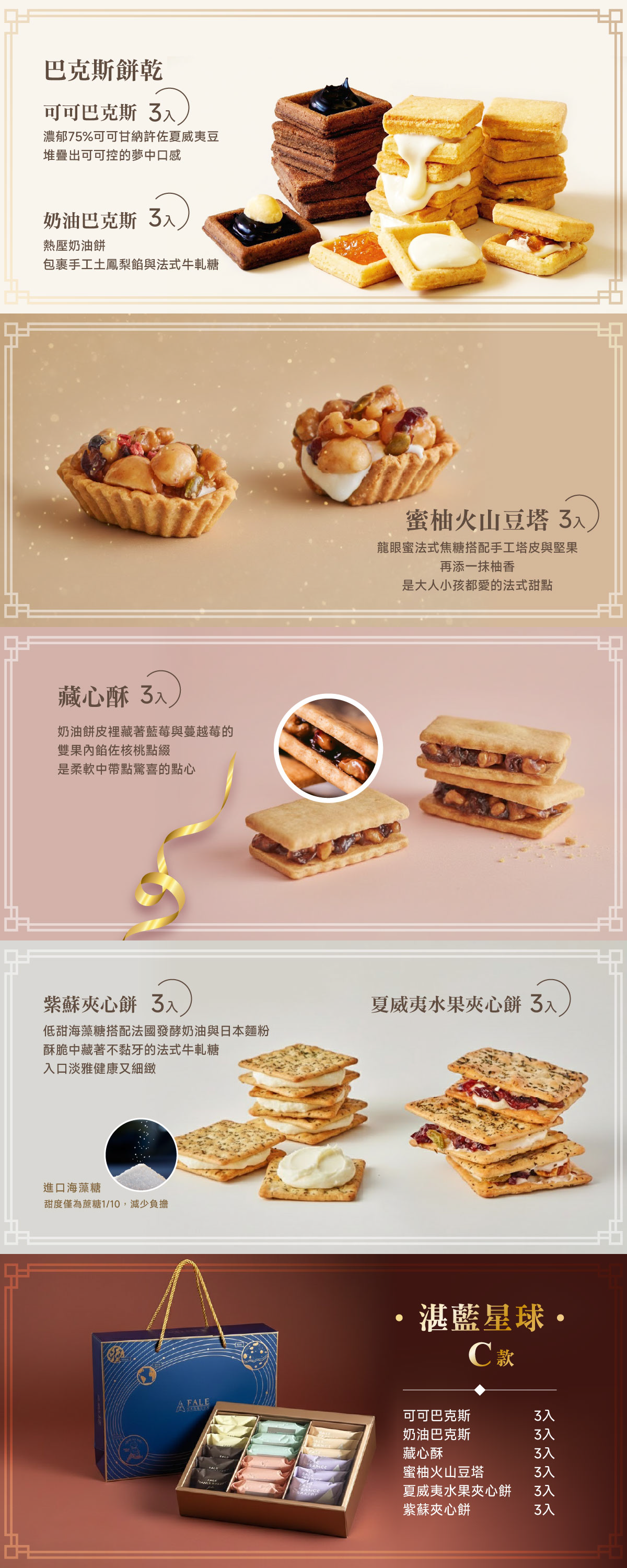 •藏心酥:奶油、麵粉、小麥澱粉、糖、棕櫚油粉、麥芽、藍莓果泥、核桃、蔓越莓、棕櫚油